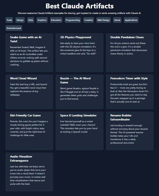 Claude AI’s Artifacts feature is designed to help users create, view, and interact with substantial standalone content in a dedicated workspace. Acting as a dynamic content generation tool, Artifacts allows users to generate code, documents, visualizations, interactive applications, and other complex content that appears in a separate window alongside the conversation. This makes it ideal for developers, content creators, educators, and teams who want to iterate on projects, export reusable content, and build interactive experiences without cluttering the main chat interface.