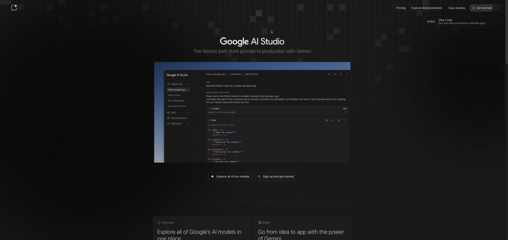 Google AI Studio is a free, web-based tool that lets you experiment with Google’s powerful AI, known as Gemini. Think of it as a “test kitchen” or a “sandbox” where you can try out ideas and see what the AI can do. It helps anyone, from business owners to creators, quickly build and test new AI concepts. It stands out because it lets you turn your ideas into simple, working apps just by describing them.