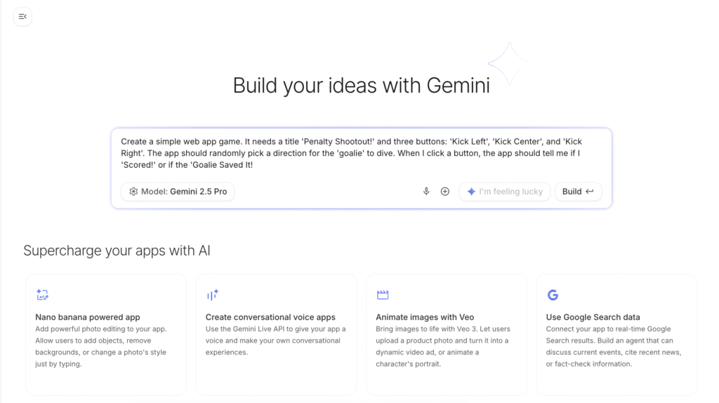 For instance, we used Google AI Studio to build a simple “Penalty Shootout” game app. We used a simple chat prompt to describe the game we wanted, and AI Studio generated the HTML, CSS, and JavaScript to make it work.