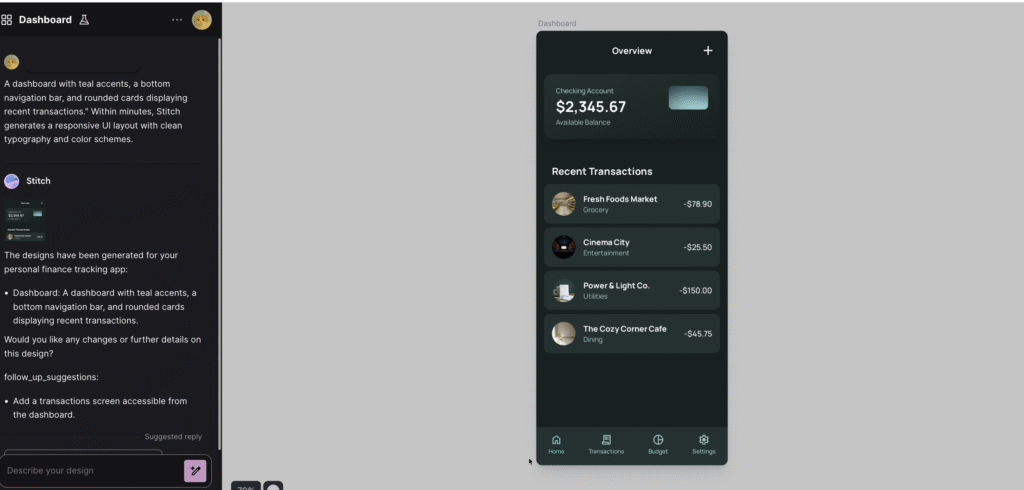 Solution: Using Google Stitch, the founder describes the desired interface: “A dashboard with teal accents, a bottom navigation bar, and rounded cards displaying recent transactions.” Within minutes, Stitch generates a responsive UI layout with clean typography and color schemes.