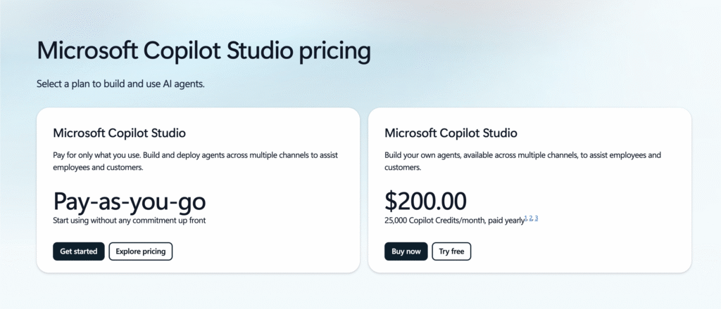 At the time of writing, Microsoft Copilot Studio is available as a Pay-as-you-go model and a US$200 monthly option.